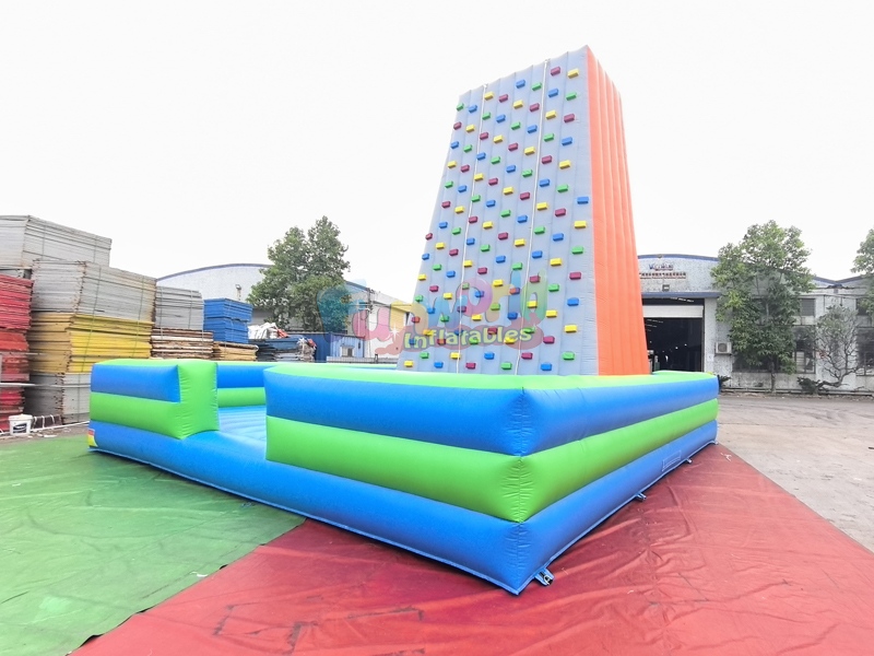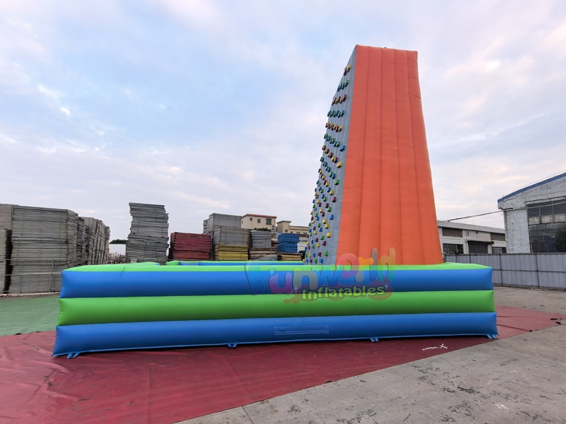 This rock climber inflatable climbing wall, it's constructed from heavy-duty, commercial-grade PVC tarpaulin, typically consists of a tall, vertical climbing tower with multiple rows of durable hand-holds, surrounded by a large, cushioned inflatable base for safety. These versatile units are ideal for school carnivals, corporate team-building, and birthday parties, providing a "wow" factor that draws crowds. Setup is efficient, requiring a powerful blower (often included) and a relatively small footprint, allowing them to be installed in both indoor and outdoor venues. They are designed to hold significant weight, often supporting participants up to 200–250 lbs.
