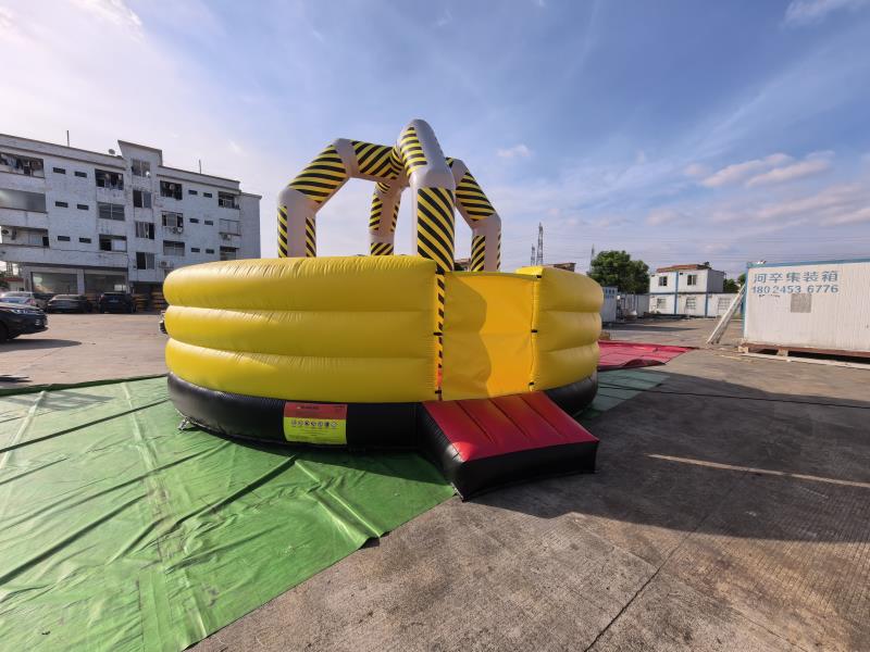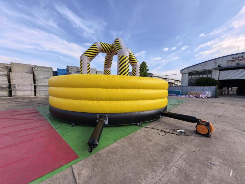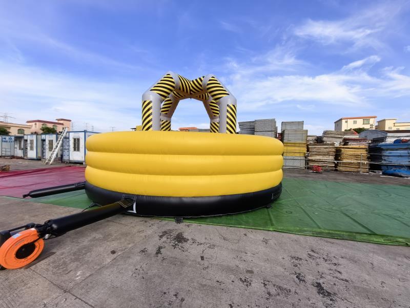 كرة هدم بيت القفز يتميز بإطار دائري قابل للنفخ متعدد الطبقات، بلون أصفر زاهٍ ونابض بالحياة، مما يضفي عليه مظهراً جذاباً وحيوياً. وقد تم تعزيز الجزء السفلي من الإطار بحافة سوداء سميكة قابلة للنفخ، مما يعزز تباين الألوان ويزيد من ثبات القاعدة.