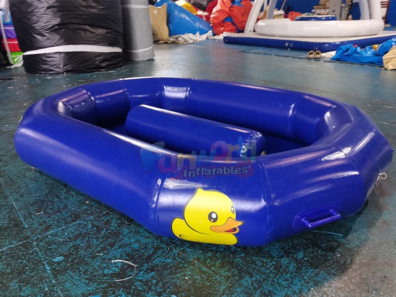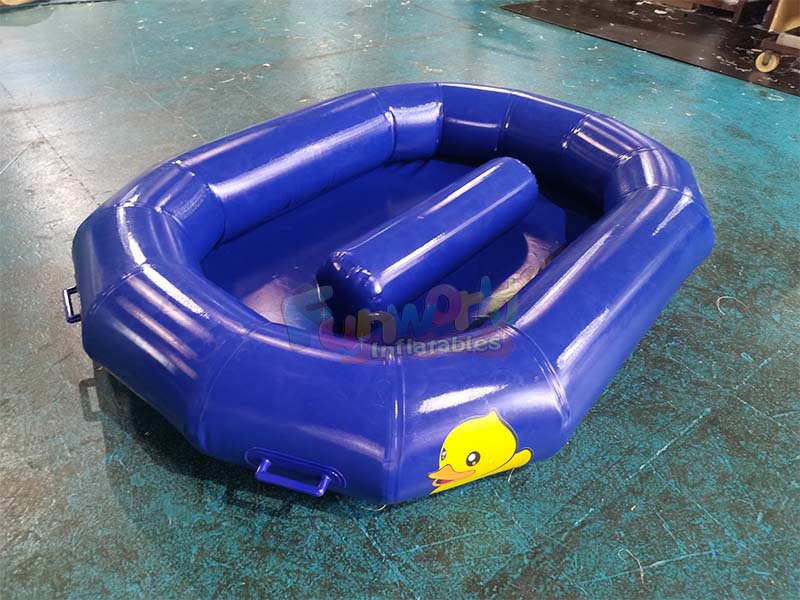 لعبة صيد البط القابلة للنفخيتميز التصميم الأزرق بشكل حلقة مغلقة مستديرة ومربعة الشكل. مصنوع من مادة PVC لامعة ومتينة، مما يمنحه ملمسًا قويًا. يوجد عمود أسطواني قابل للنفخ في وسط الحلقة، بينما تتوزع كتل التحديد الصفراء على الجانب الخارجي. توجد مقابض أرجوانية في عدة زوايا لسهولة الاستخدام.