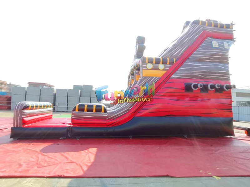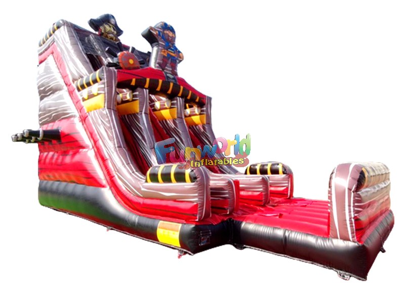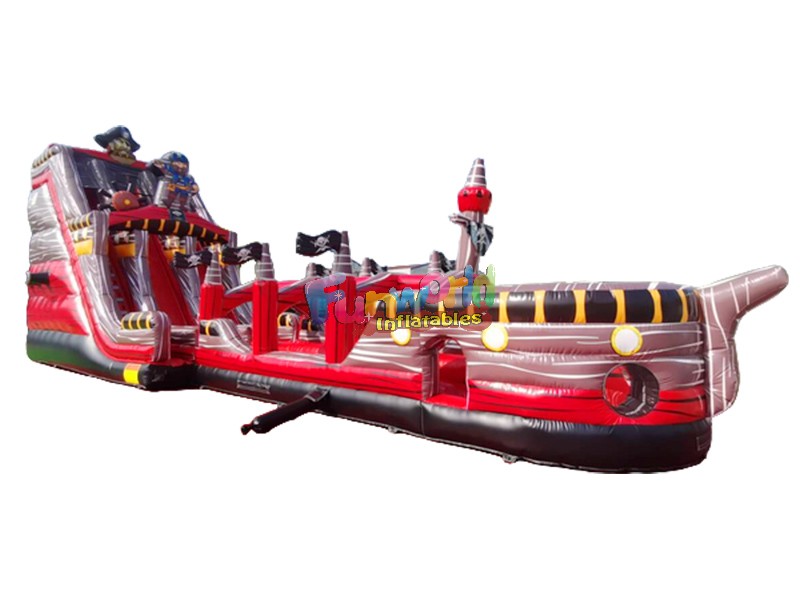 هذا المنزلق المائي القابل للنفخ على شكل سفينة قراصنة، مصمم ليُحاكي سفينة شراعية أسطورية، يتميز بمقدمة سفينة واقعية، وصواري شاهقة، ورسومات بحرية جريئة كالمراسي والفتحات. ألوانه الزاهية من الأحمر والأسود، إلى جانب أعلام الجمجمة والعظمتين المتقاطعتين، تأسر خيال الصغار والكبار على حد سواء. يوفر المنزلق مسارين للانزلاق، مما يسمح لمغامرين اثنين بالتسابق نحو خط النهاية في وقت واحد. نظام مائي متكامل يحافظ على انسيابية المنزلق ويُبقي المتزلجين مبللين من أعلى الصاري وحتى النهاية. ينتهي الانزلاق في حوض سباحة كبير قابل للنفخ في مقدمة السفينة، ليُوفر استراحة آمنة ومنعشة.