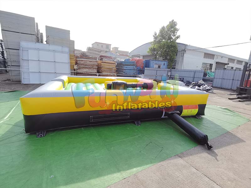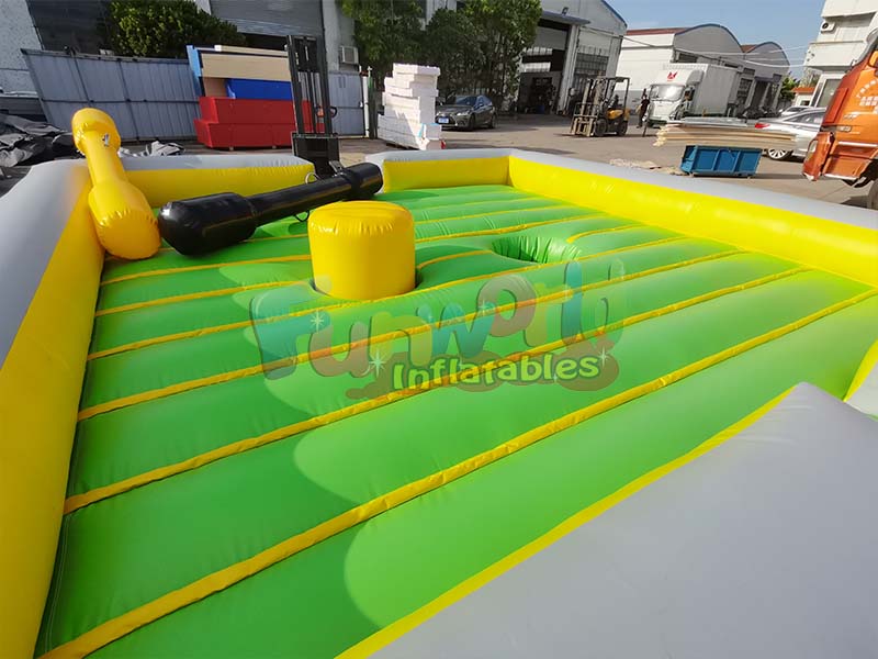 هذا لعبة قتال قابلة للنفختُصمّم هذه الساحة غالبًا على غرار حلبة مصارعة أو حلبة ملاكمة. تتميز بألوانها الصفراء والسوداء الزاهية، وعصاتين قابلتين للنفخ بإحكام. يتنافس فيها لاعبان يقفان على منصات مرتفعة قابلة للنفخ، حاملين عصي ملاكمة كبيرة الحجم مبطنة بالإسفنج. يُضفي سطح الساحة المرن وغير المتوقع تحديًا إضافيًا على النزال، مما يُجبر اللاعبين على التركيز على التوازن بقدر تركيزهم على الهجوم. الهدف هو إسقاط الخصم من منصته إلى الساحة المطاطية المحيطة، مما يجعلها منافسة مثيرة من نوع "آخر من يبقى واقفًا".
