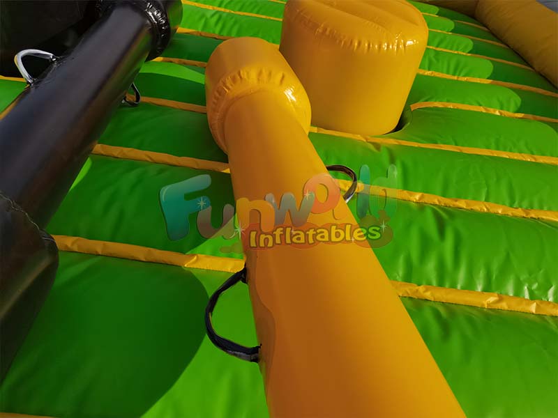ألعاب قتالية خارجية قابلة للنفخ، تتميز بألوانها الصفراء والسوداء الزاهية، وتتضمن عصوين قابلتين للنفخ بإحكام. يتنافس لاعبان يقفان على منصات مرتفعة قابلة للنفخ، حاملين عصي قتالية كبيرة الحجم مبطنة بالإسفنج. صُنعت هذه الوحدات من مواد متينة مقاومة للعوامل الجوية، ما يجعلها مناسبة للاستخدام الداخلي والخارجي. توفر هذه الألعاب تحديًا بدنيًا ممتعًا وآمنًا لجميع الأعمار، دون أي خطر للإصابة، مما يتيح تجربة قتالية وهمية آمنة.