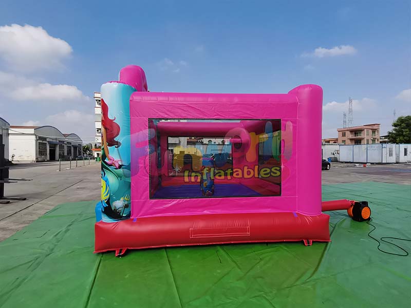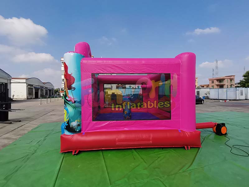 يتميز بيت القفز على شكل حورية البحر بتصميم قابل للنفخ ومجهز بصمامات هواء آمنة، مما يجعل عملية النفخ والتفريغ مريحة للغاية.