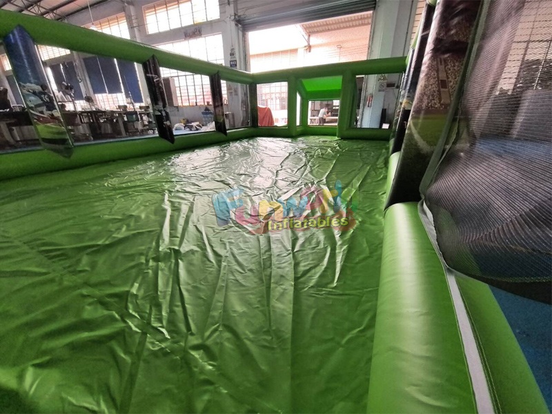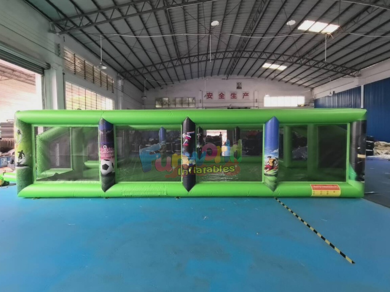 تتميز الألواح الجانبية بشبكة متينة عالية الشد، مما يوفر رؤية ممتازة للمشاهدين ويضمن بقاء الكرة داخل حدود الملعب. كما تحتوي نهايات الملعب على أعمدة مرمى قابلة للنفخ مدمجة، مزودة بشبكة، مما يخلق هدفًا متينًا وسلسًا للمهاجمين. وعلى الرغم من حجمها الكبير، يمكن تفريغ الوحدة من الهواء إلى حجم مناسب للنقل، ويمكن تركيبها بالكامل في دقائق باستخدام منفاخ كهربائي قوي.