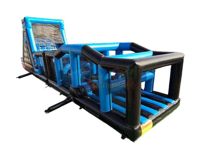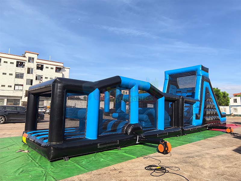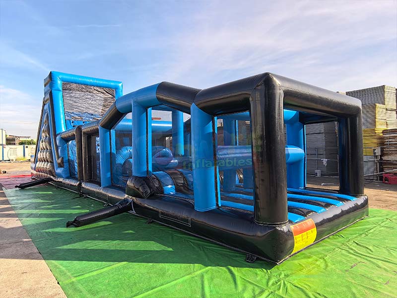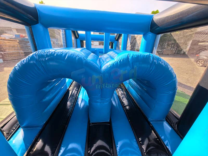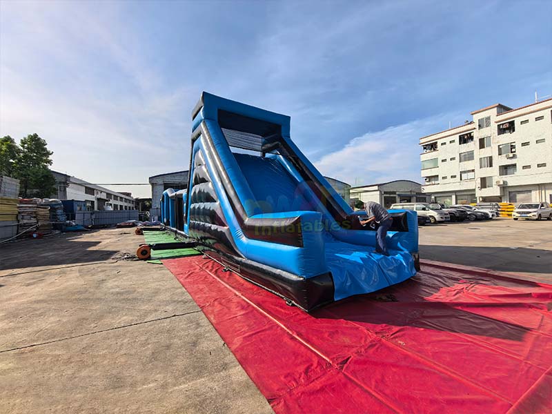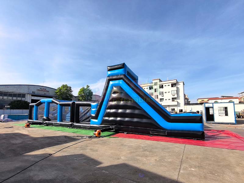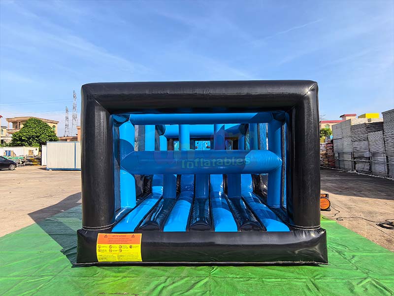 مسار عقبات قابل للنفخ عملاق يتميز بإطار مربع مع أعمدة سوداء سميكة قابلة للنفخ وحشو أزرق فاتح عند المدخل، ويكمله سطح شبكي شفاف. يُعزز التباين القوي بين الكتل السوداء والزرقاء سهولة التعرف عليها مع الحفاظ على انفتاح بصري. يتضمن مسار العوائق عوائق منحنية قابلة للنفخ بهيكل ناعم ومرن يتميز بخطوط زرقاء وسوداء متناوبة، مما يضفي انحناءً ديناميكيًا على الإطار الصلب. منحدر التسلق الشاهق مغطى بطبقة سوداء بارزة مانعة للانزلاق، مع حواف زرقاء زاهية تُحدد معالمه. الجزء العلوي مزود بإطار علوي مربع أزرق قابل للنفخ، يُحاكي الإطار الأمامي بصريًا، مما يخلق خطوطًا أنيقة وديناميكية.