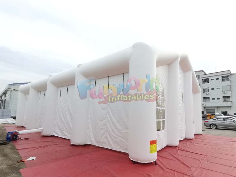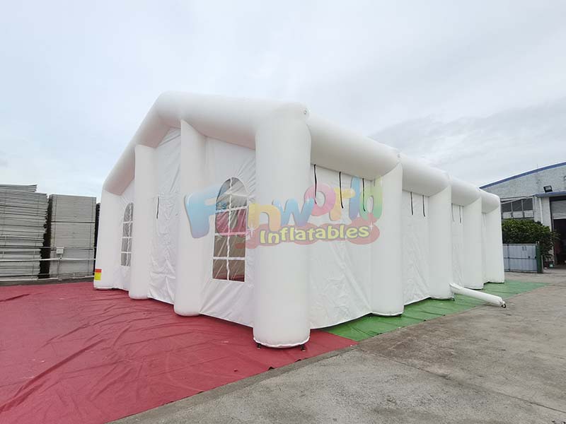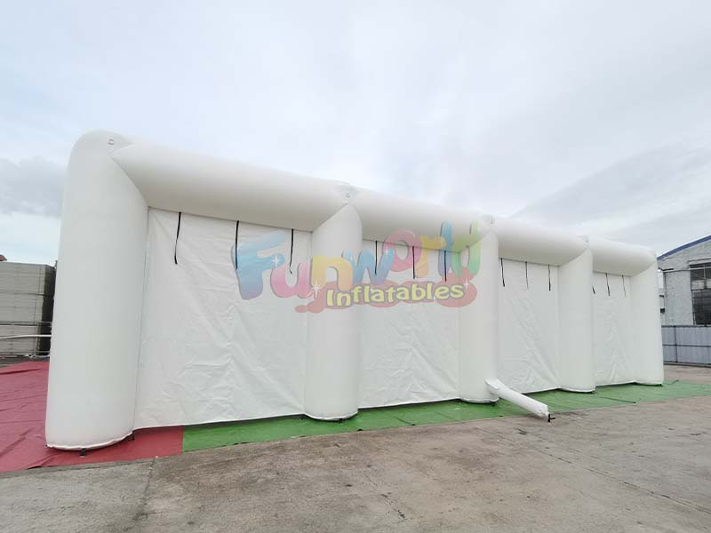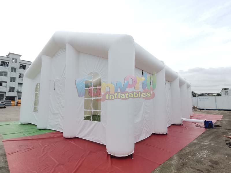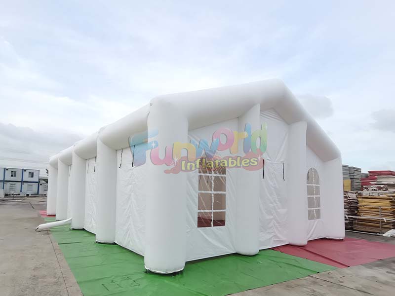خيمة زفاف قابلة للنفخيتميز تصميمها المميز بهيكل قابل للنفخ مع عدة أعمدة بيضاء متينة قابلة للنفخ موزعة بالتساوي لدعم سقف أملس مقوس، مما يمنحها مظهرًا أنيقًا وراقيًا. يغطي القماش الأبيض السميك ذو الملمس الناعم سطح الخيمة، وينتفخ بالتساوي، مما يخلق واجهة مسطحة ومتينة. يتميز تصميمها الأبيض النقي بالبساطة والأناقة، مما يجعلها جذابة للغاية في الأماكن الخارجية. كما تتميز بمرونة فائقة في التصميم، حيث تنسجم بسلاسة مع مختلف السيناريوهات، من العروض التجارية العصرية والاحتفالات الخارجية إلى حالات الطوارئ العملية.