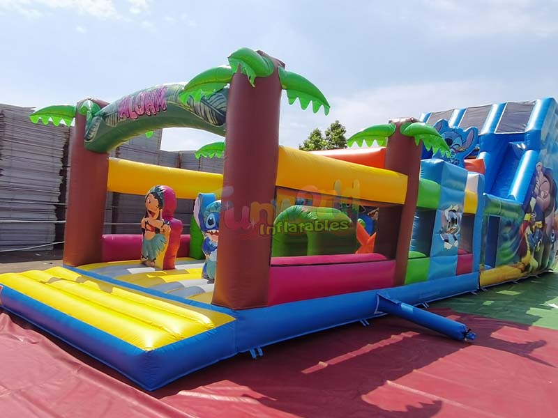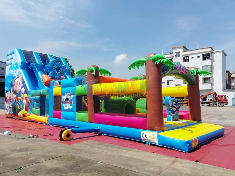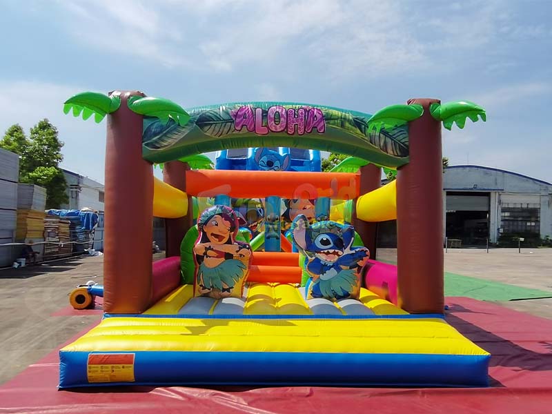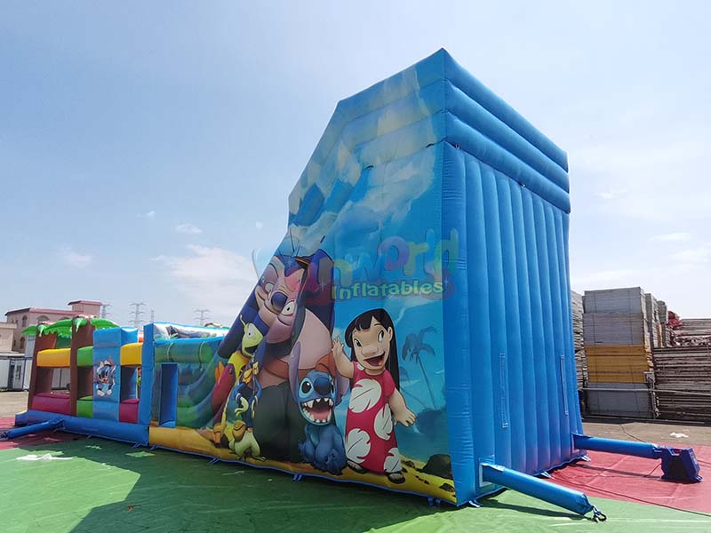 تجمع الشريحة القابلة للنفخ الكبيرة من Lilo Stitch بين الشريحة والترامبولين ومسار العوائق وغيرها من الوحدات الوظيفية، كما تتمتع بإحكام الهواء ومتانة ممتازة.
