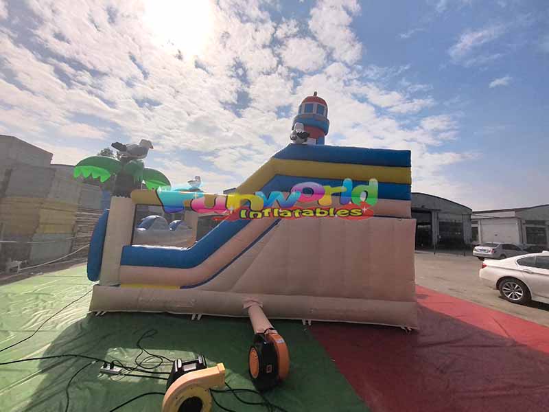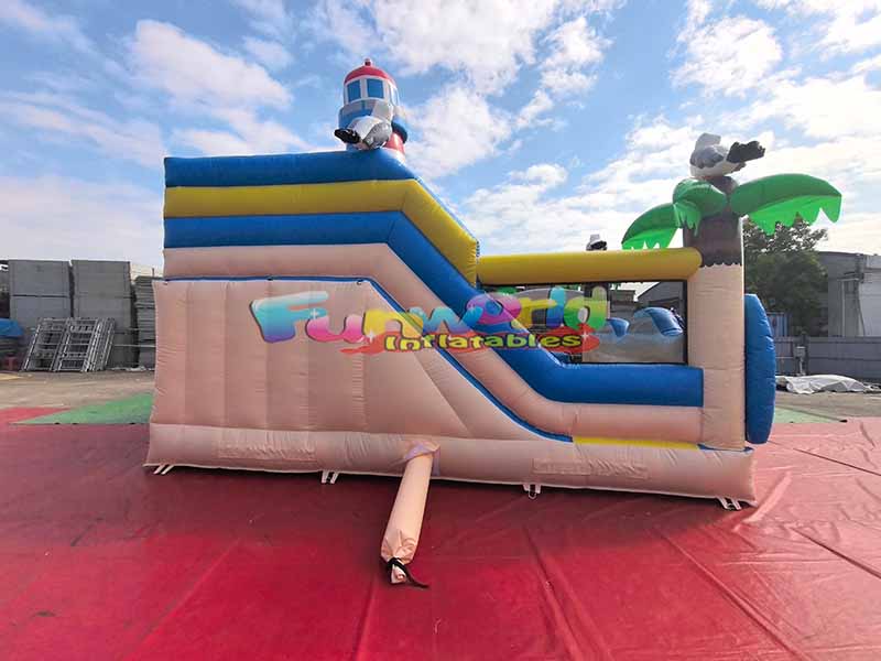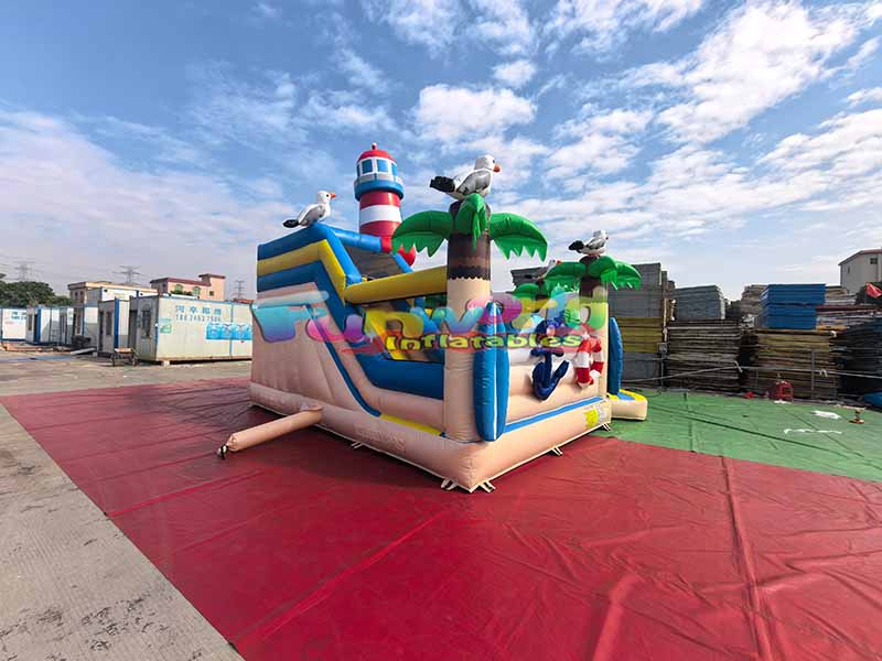 يتميز بيت القفز القابل للنفخ التجاري بأجواء منتجع ساحلي، مع برج رئيسي طويل على شكل منارة محاط بطيور النورس الرائعة وأشجار النخيل الخضراء المورقة.