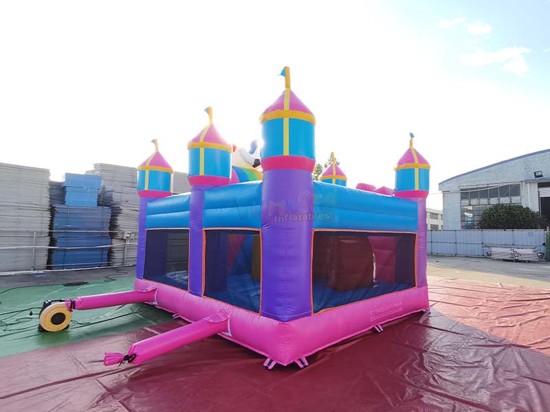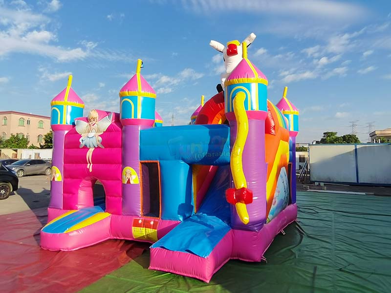 بيت نطاط يونيكورن كومبو تتميز الصورة بجنية ذات أجنحة، بتفاصيل واضحة على فستانها وأجنحتها. وتوجد أيقونات جنية متطابقة على كلا الجانبين، مما يعزز أجواء القصص الخيالية.يوجد منزلق أزرق زاهٍ على الجانب الأيمن من القلعة، وفوقه قوس أحمر مزخرف. يجلس وحيد قرن أبيض بقرون حمراء على قمة القوس، بتعبير وجه رقيق وجذاب.تحتوي القلعة على مدخل في الأسفل، بدرج مزين بألوان الوردي والأزرق والأصفر. يتميز التصميم العام بشكله الدائري والممتلئ، مما يضفي عليها سحراً مرحاً وبسيطاً.