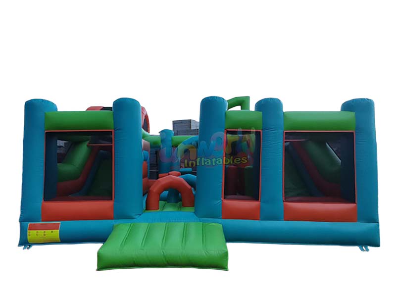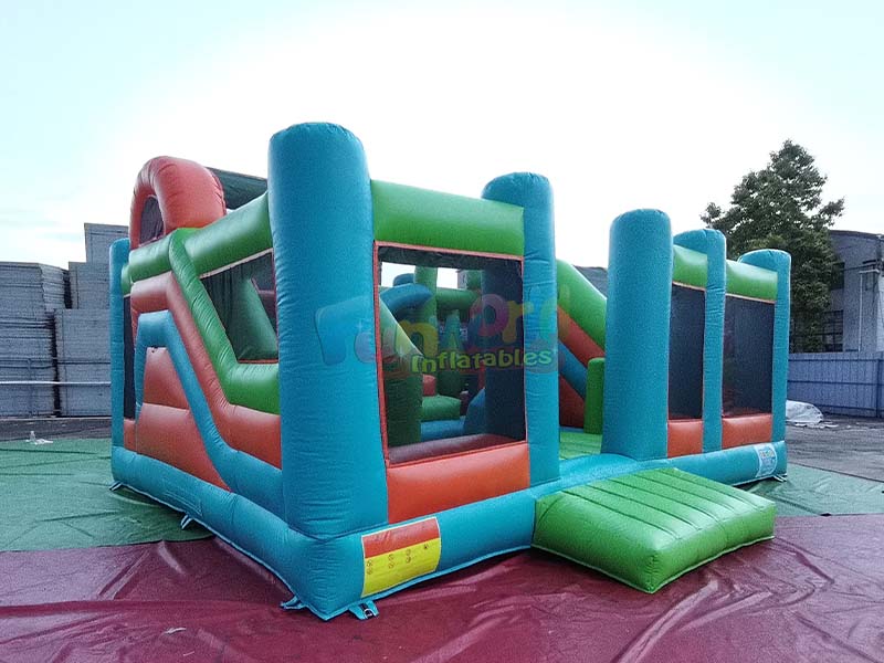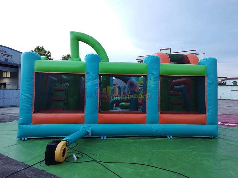 يتميز مسار العقبات القابل للنفخ الكبير في الفناء الخلفي بكتل أنيقة الشكل وقطع مصنوعة بعناية. بمجرد نفخه، يصبح ناعمًا ومرنًا، مما يوفر الدعم والمرونة، مما يسمح للأطفال بالتسلق بسهولة وراحة تامة عند الجلوس أو الاستلقاء. شرائط تقوية خضراء رفيعة، موضوعة عند اللحامات والمواقع التي تتحمل الضغط، لا تعزز فقط ثبات هيكل القوس، بل تُكمل أيضًا جماله العام، حيث يمتزج بشكل رائع مع الهيكل الرئيسي.