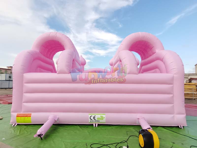 هذا قلعة نطاطة قابلة للنفخ باللون الوردي الفاتح يتميز هذا المجسم بلونه الوردي الفاتح النابض بالحياة وتصميمه المعماري الكلاسيكي المستوحى من القلاع، مما يجعله قطعة مركزية جذابة لأي احتفال. غالبًا ما يتضمن حلقات معدنية على شكل حرف D لتزيينه بالبالونات أو الزهور، مما يسمح بتخصيصه ليناسب موضوعات المناسبات المختلفة. يتضمن التصميم أربعة أبراج شاهقة ذات قمم مدببة، ومدخلين/مخرجين مقوسين كبيرين يؤديان إلى الزلاقات، ومنطقة هبوط واسعة قابلة للنفخ، وحوض كرات كبير في المقدمة، مما يجعله قطعة مركزية جذابة لأي احتفال، ويضمن ساعات من الترفيه النشط والذكريات الساحرة.