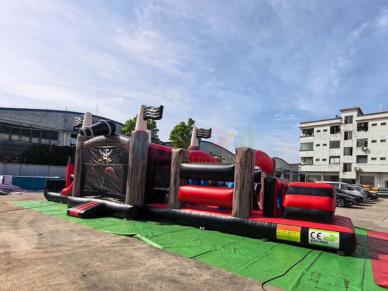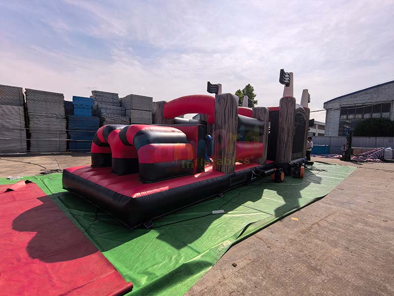 بيت نطاط متعدد الاستخدامات (رطب وجاف)تتميز هذه المجموعة بشكل أساسي باللونين الأحمر النابض بالحياة والأسود الأنيق، مع أعمدة قابلة للنفخ بلون بني داكن يُحاكي الخشب، مما يخلق تباينًا لونيًا لافتًا يُجسد في الوقت نفسه الطابع الكلاسيكي لموضوع القراصنة. تتزين العديد من الأعمدة بأبراج بيضاء وأعلام سوداء عليها جمجمة وعظمتان متقاطعتان، وتتميز تصاميمها بجاذبيتها وتناسقها. كما تتضمن بعض الأعمدة عناصر زخرفية سوداء قابلة للنفخ، مما يُعزز أجواء القراصنة بتفاصيلها الدقيقة.
