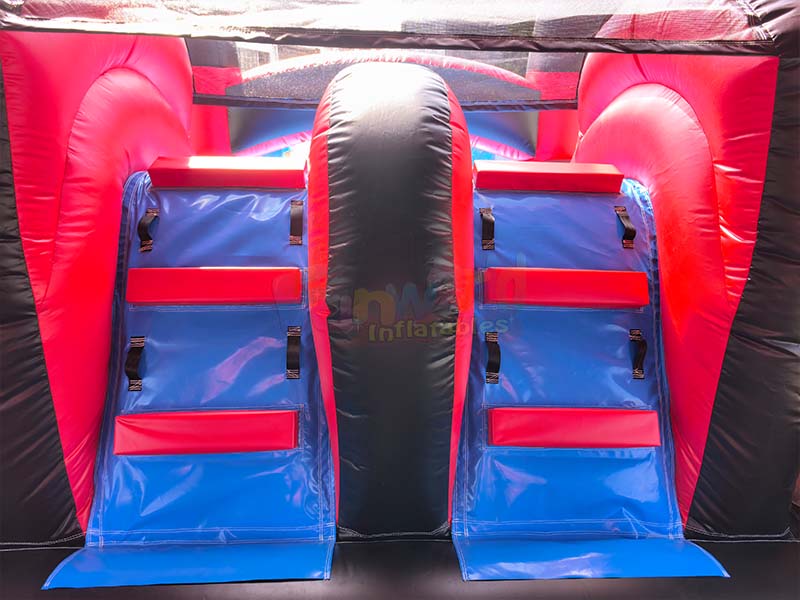 استمتع باللعب في البيت النطاط الكبير. تُثبّت العوائق القابلة للنفخ بإحكام على القاعدة الحمراء بخياطة متقنة. تتميز الخلفية بألواح حمراء قابلة للنفخ ذات فتحات دائرية، لا تُستخدم فقط كفواصل للمساحة، بل تُعزز أيضًا الشعور بالرحابة في المكان، وتُثري تجربة اللعب التفاعلية.