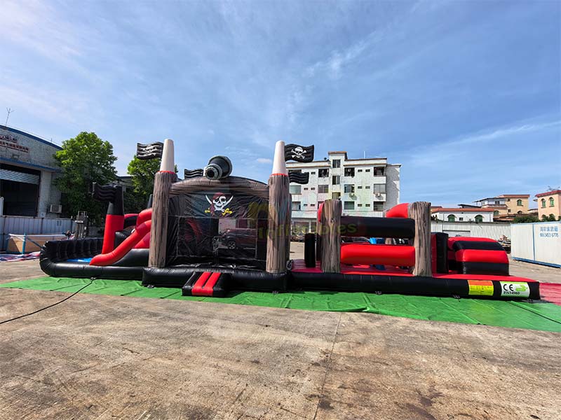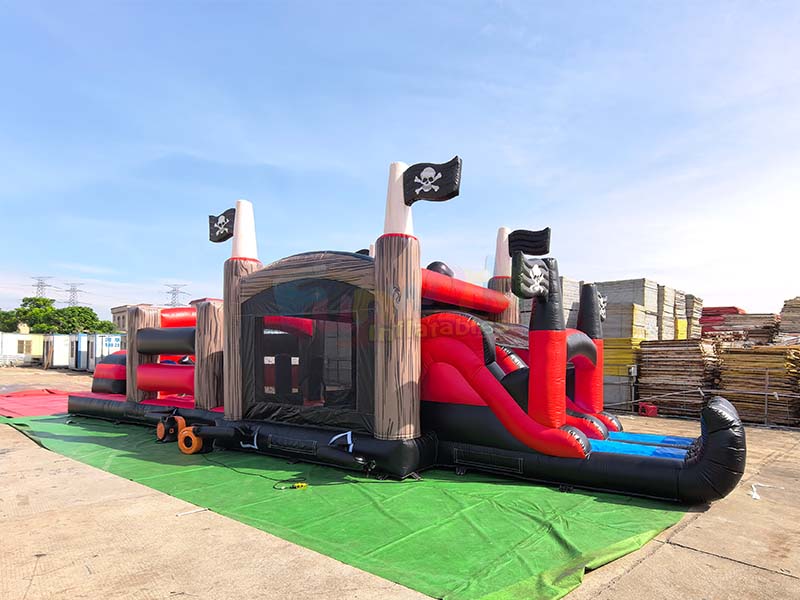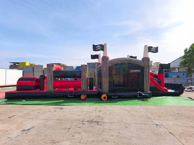 يجمع بيت القفز على شكل سفينة قراصنة بين الزلاقات والقفزات والأشكال المرحة. وتخلق الأعمدة ذات المظهر الخشبي وتصميم علم الجمجمة أجواءً قرصانية غامرة.