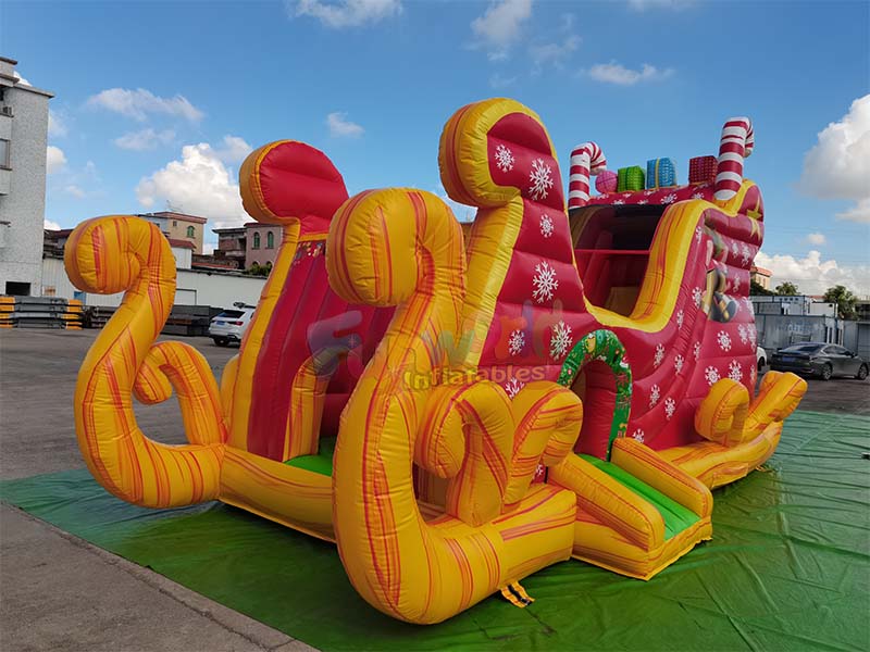 منزل نطاط قابل للنفخ لعيد الميلاد يُضفي تأثيرًا بصريًا مُلفتًا. زُيّن الجزء الخارجي بنقوش ندفة الثلج البيضاء، مُضفيًا جوًا عيد ميلاديًا غنيًا. يتميز القسم الأصفر بخطوط برتقالية وصفراء تُشبه عصي الحلوى، وتُضفي الزخارف المُبالغ فيها والمُنحنية على كل جانب تصميمًا حيويًا وطفوليًا. كما زُيّن الجزء العلوي بصندوق هدايا مُلوّن وتصاميم عصي حلوى حمراء وبيضاء، مما يُضفي تفاصيل غنية. يُعيد هذا الكرسي الهزاز القابل للنفخ إحياء الصورة الكلاسيكية لمزلجة عيد الميلاد، بينما يُضفي شكله الكامل القابل للنفخ وزخارفه الغنية تأثيرًا بصريًا حالمًا ومُلفتًا للنظر.